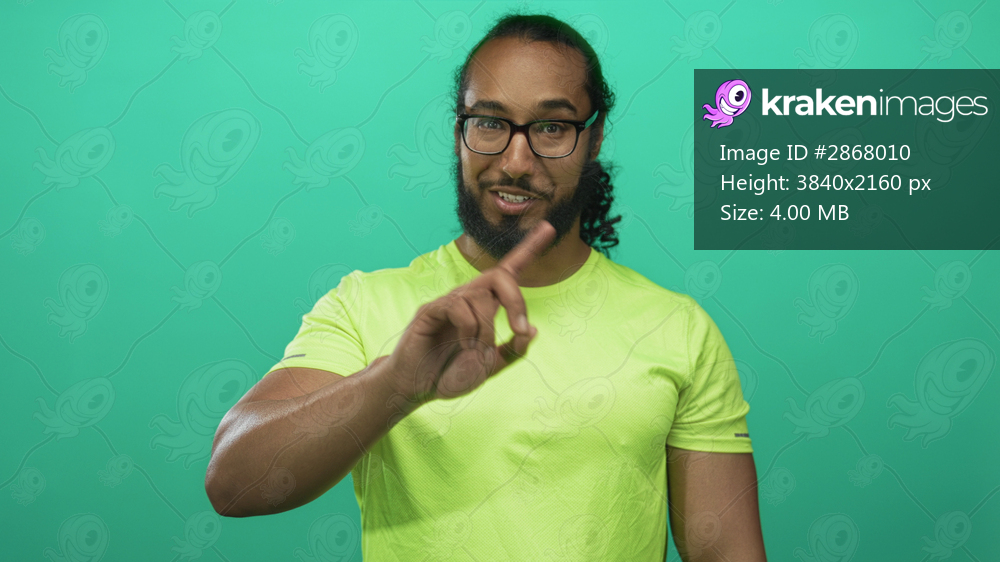 Man pointing finger toward camera in teal studio wearing neon green shirt and glasses; greeting confidence.