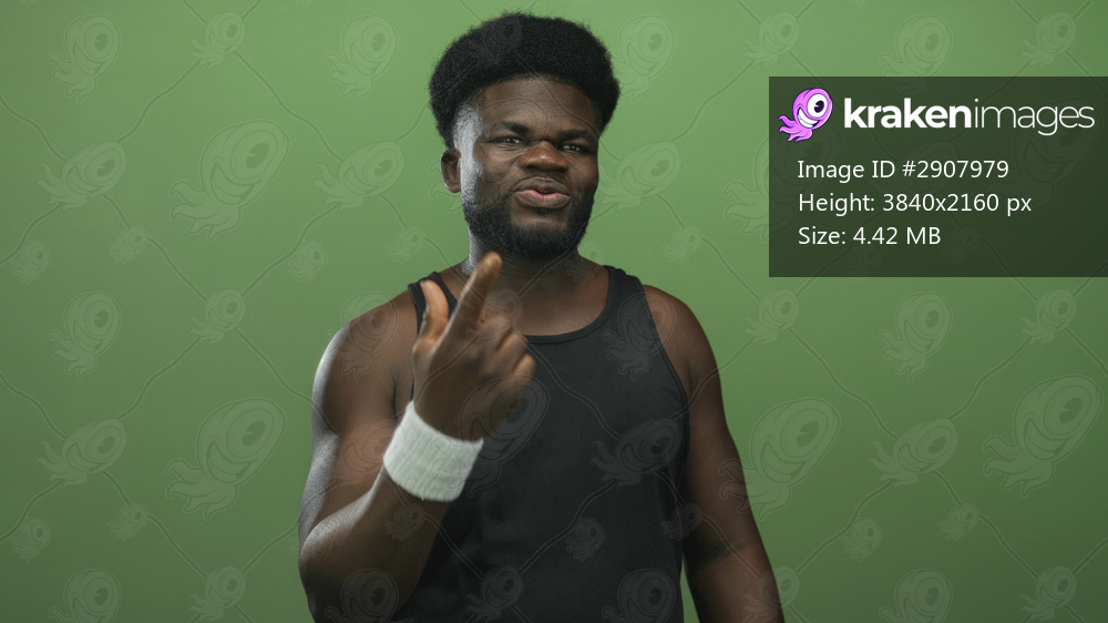 Man pointing finger toward camera and raising hand with white wristband in studio against a green wall; confidence motivation.
