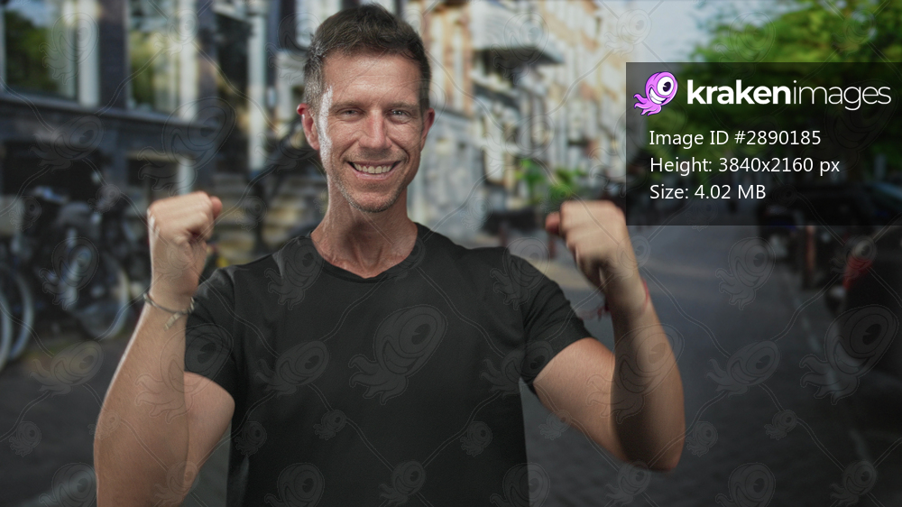 Man pointing finger toward camera while flexing right arm and smiling in black tshirt on street; confidence triumph.