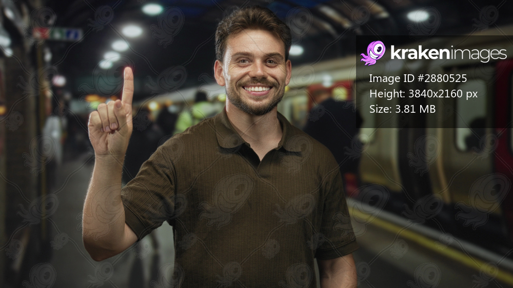 Man pointing finger up at a train on an indoor platform inside a building station, smiling and facing camera; confidence approachability.