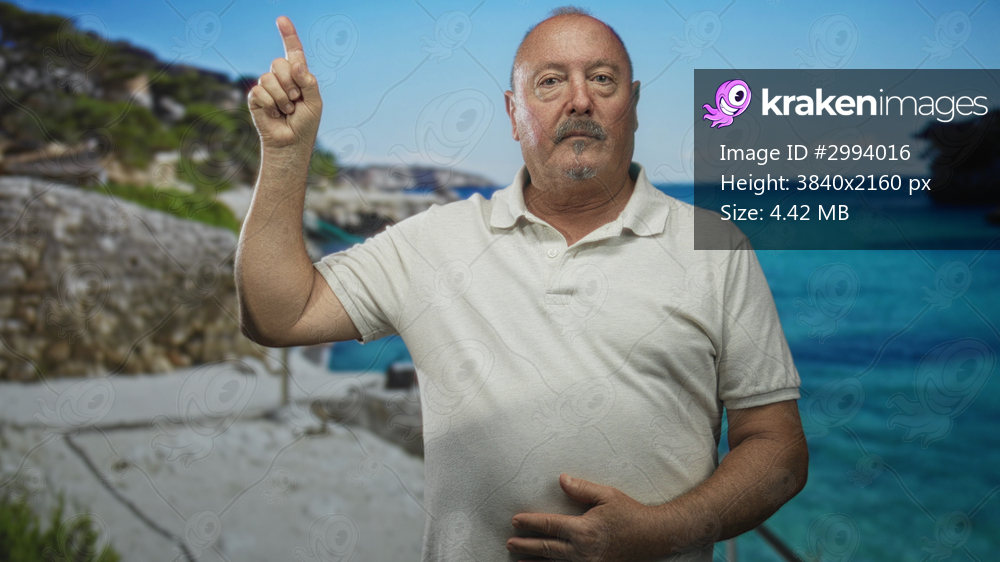 Man pointing finger upward with hand on stomach in studio with beach backdrop and white polo; serious instruction.