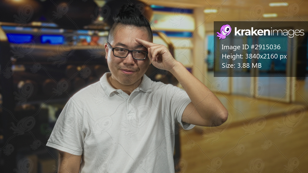 Man pointing finger upward in studio gym while smiling, wearing glasses and white polo and raising arm; confidence.