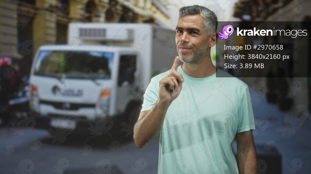 Man pointing finger upward on a crowded city street with a delivery van, yellow taxi and parked scooters, middle-aged with grey hair in a mint t shirt; alert focus. - Kraken Images