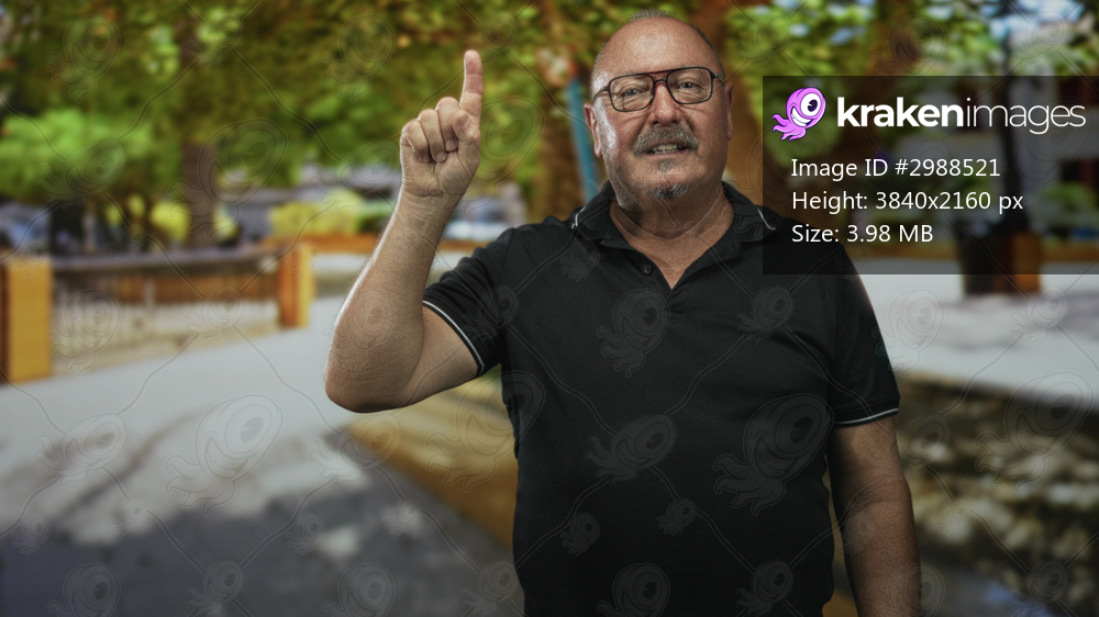 Man pointing finger upward on street near fountain and trees, wearing glasses and a polo shirt, index finger raised; confidence instruction.