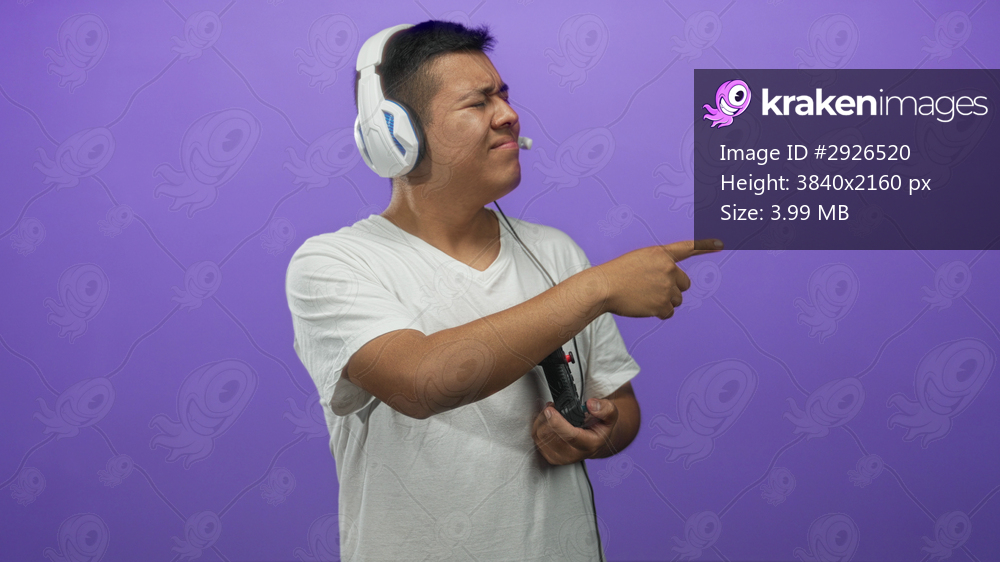 Man pointing finger while holding game controller and wearing headset in purple studio; concentration gaming.