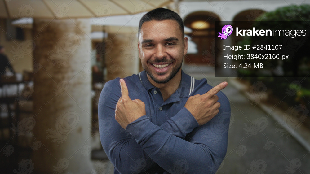 Man pointing fingers across chest in building wearing blue polo shirt with trimmed beard and short haircut; excitement.