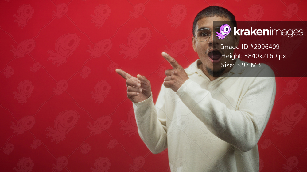 Man pointing fingers with open mouth and glasses in studio against red backdrop; surprise playful curiosity.