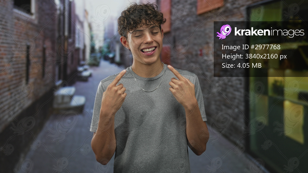 Man pointing fingers to his smile in a narrow cobblestone street, wearing gray t shirt and silver chain necklace; youthful joy confidence.