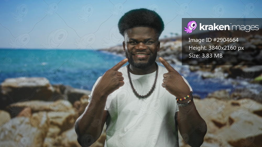 Man pointing fingers to mouth at studio set with rocky coast backdrop and turquoise sea visible; joy celebration relaxation.