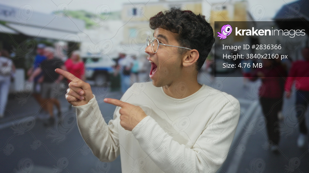 Man pointing fingers to the side on a busy urban street with mouth open; surprise excitement amazement joy.