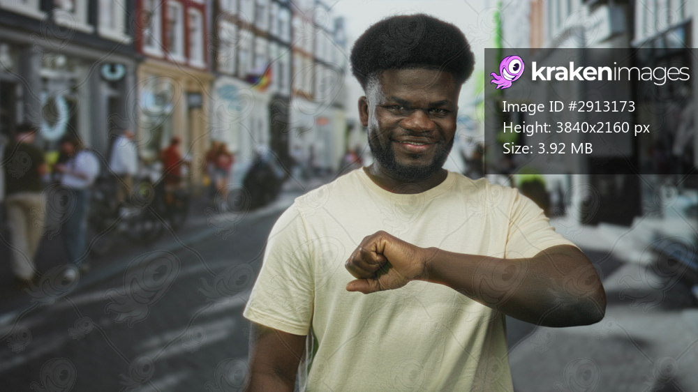 Man pointing fist at camera on busy city street smiling broadly and leaning forward, wearing pale yellow t shirt; confidence.