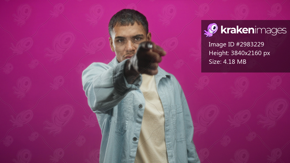 Man pointing hand toward camera in studio with pink backdrop and neutral expression; confidence assertiveness.