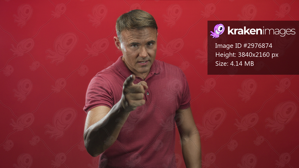 Man pointing index finger at camera in red studio wearing a polo shirt with visible forearm and direct gaze; confidence.