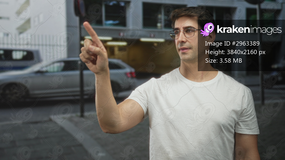 Man pointing index finger forward on a city street beside parked van and sidewalk, wearing glasses and white t shirt while gazing intently; curiosity discovery. - Kraken Images