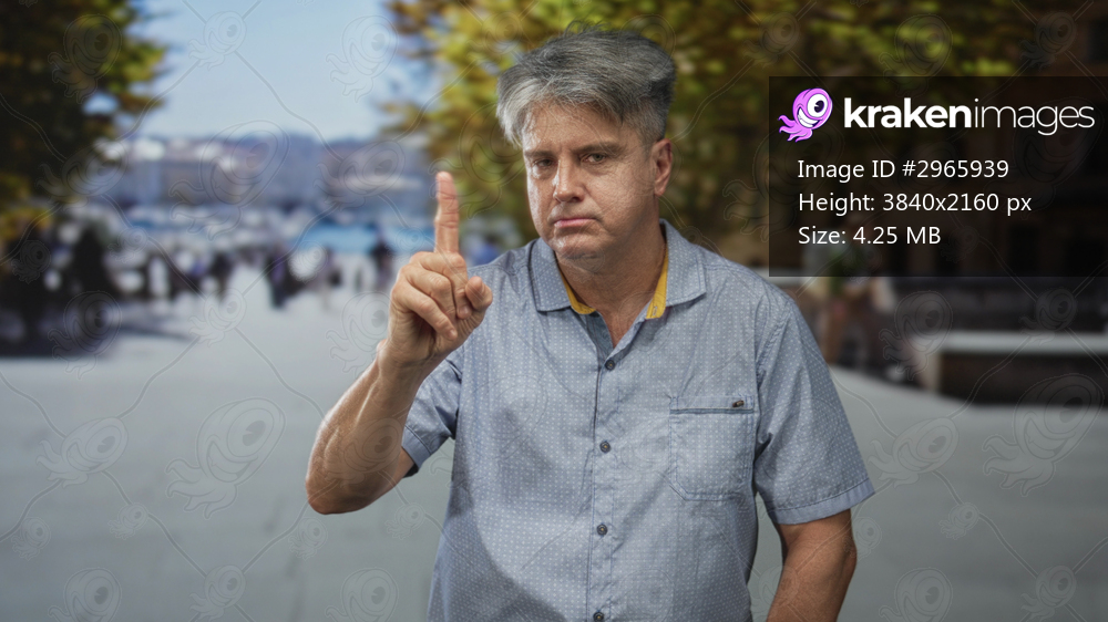 Man pointing index finger with raised hand and unsmiling face, gray hair and short sleeve shirt on a busy street plaza; disapproval warning.