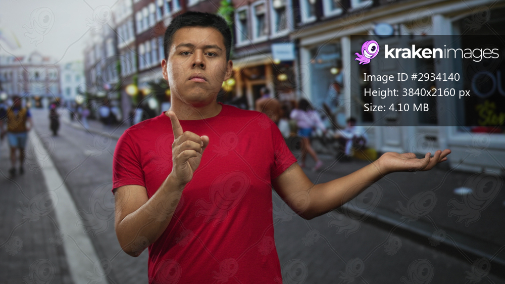 Man pointing index finger to open palm on a busy city street lined with storefronts, red tshirt visible; curiosity contemplation.