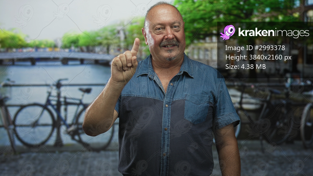 Man pointing index finger toward camera beside bicycle on canal street, wearing denim shirt and smiling; confidence guidance.