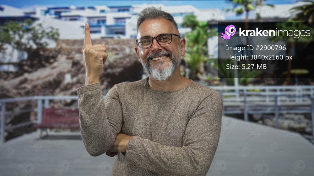 Man pointing index finger up with crossed arms in front of building on a boardwalk; confidence optimism friendliness.