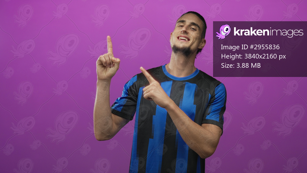 Man pointing index finger upward in studio wearing blue soccer jersey and smiling; pride confidence.