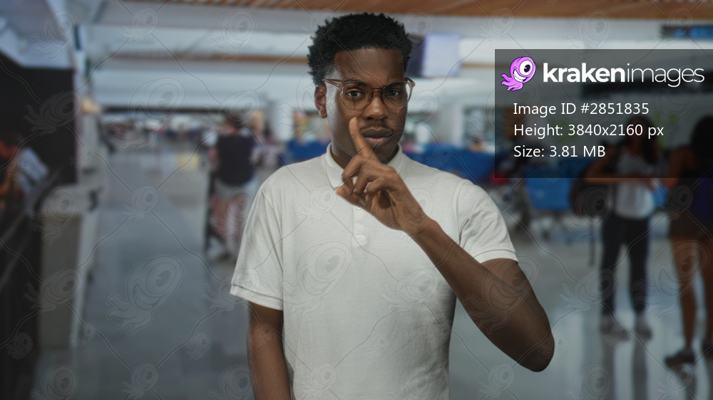 Man pointing index finger upward while wearing glasses in busy airport terminal; urgent warning and focus.