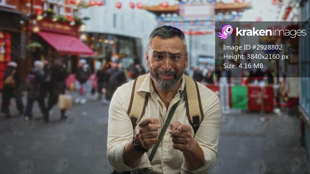 Man pointing index fingers at camera with backpack on busy street marketplace; playful travel discovery.