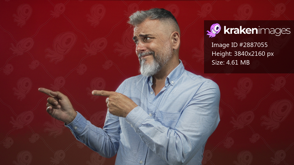 Man pointing index fingers toward opposite sides in red studio wearing light blue shirt with visible beard and hands; skeptical doubt choice reflection. - Kraken Images