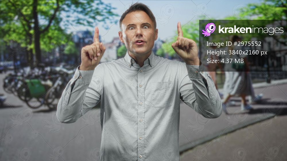 Man pointing index fingers upward and looking up, wearing a light button shirt, standing on a street with parked bicycles, trees and pedestrians; hope. - Kraken Images