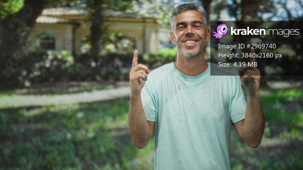 Man pointing index fingers upward, smiling and looking up with visible finger gesture in front of building in a park setting; gratitude faith.