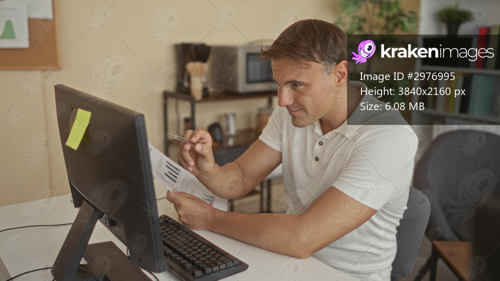 Man pointing pen at printed report while holding paper near a computer monitor on an office desk in a building; concentration diligence.