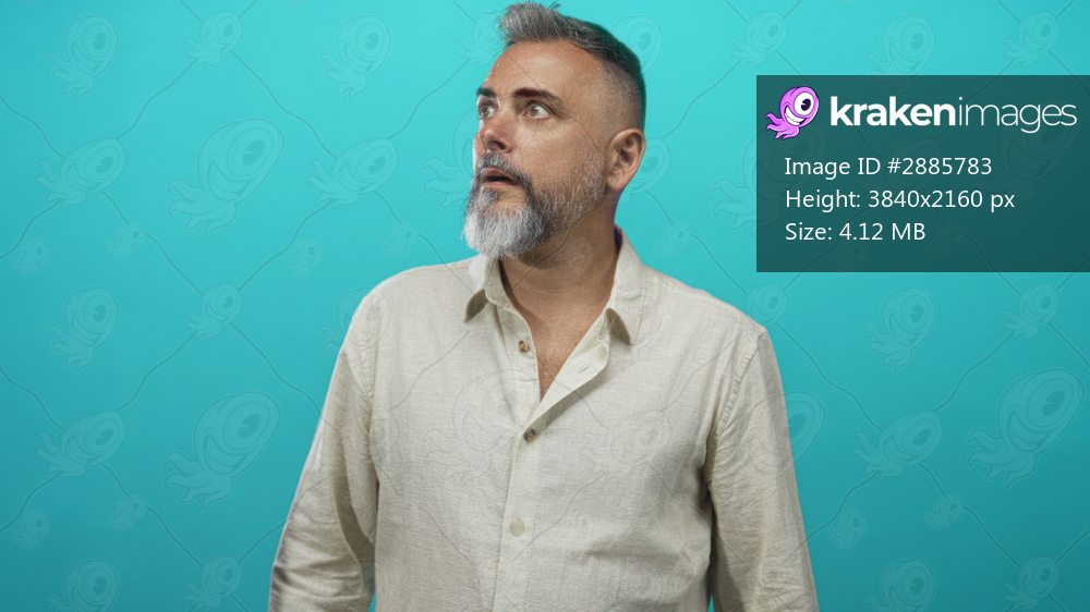 Man pointing right with finger in studio against turquoise backdrop, beige linen shirt visible and hand extended; curiosity.
