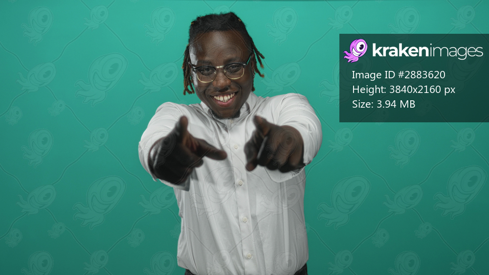 Man pointing and showing peace sign with both hands in studio against teal backdrop, wearing white shirt and glasses; playful.