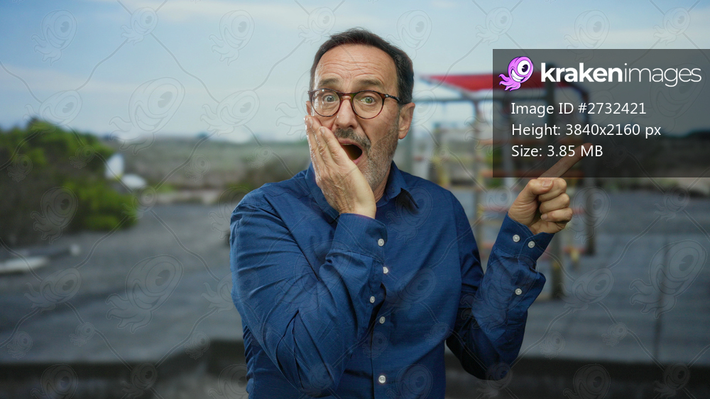Man pointing with surprise in an outdoor sports area wearing a blue shirt showcasing dynamic expressions against a blurred gym background.