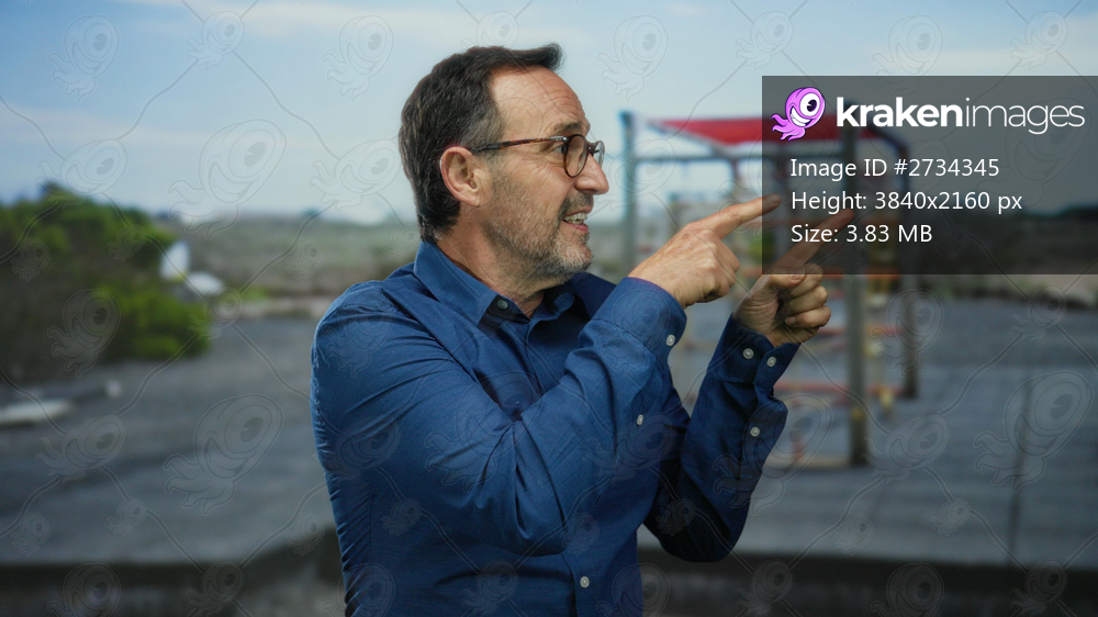Man pointing with surprise in an outdoor sports area wearing a blue shirt showcasing dynamic expressions against a blurred gym background.