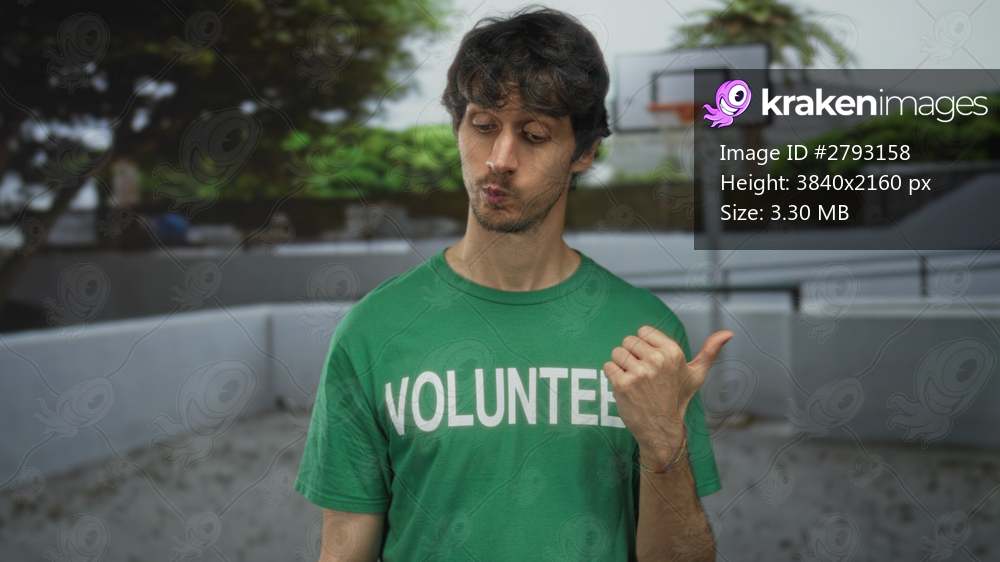 Man pointing thumb in green volunteer shirt on outdoor basketball court while pursing lips and glancing sideways; uncertainty.