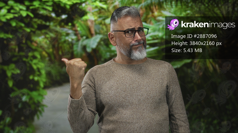 Man pointing thumb over shoulder at a green forest path, wearing glasses and grey beard with knit sweater, visible hand gesture and raised thumb; bemused skepticism. - Kraken Images