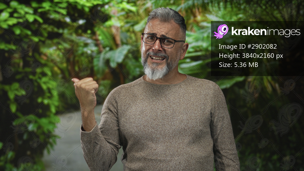 Man pointing thumb over shoulder at a green forest path, wearing glasses and grey beard with knit sweater, visible hand gesture and raised thumb; bemused skepticism. - Kraken Images
