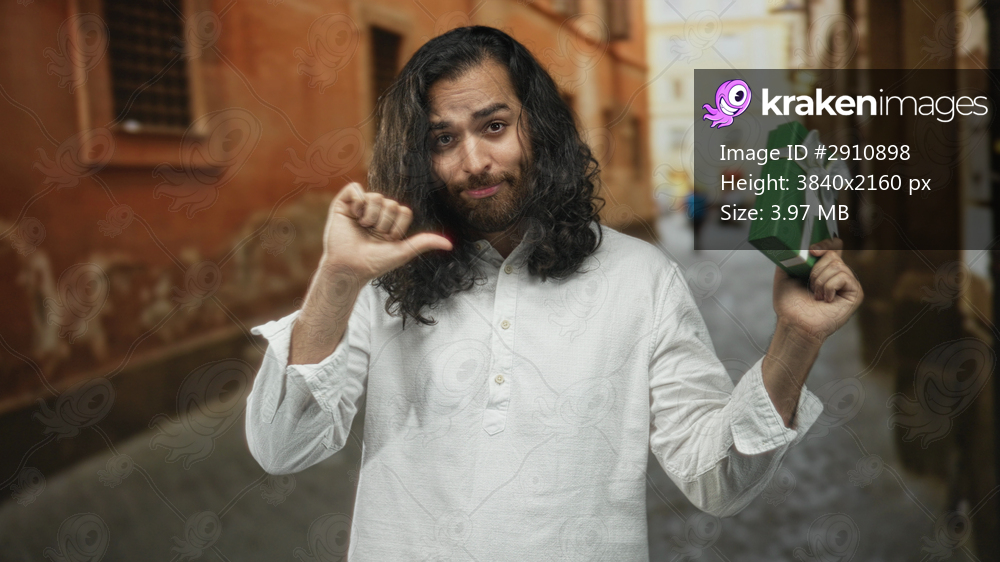Man pointing thumb to chest while holding a wrapped green gift box with white bow in a cobbled street between old buildings; self promotion confidence. - Kraken Images