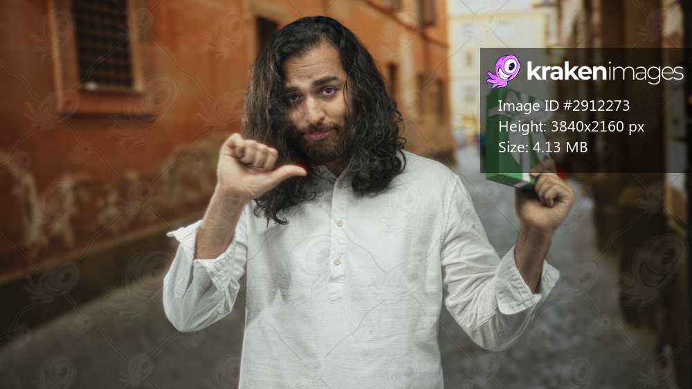 Man pointing thumb to chest while holding a wrapped green gift box with white bow in a cobbled street between old buildings; self promotion confidence. - Kraken Images