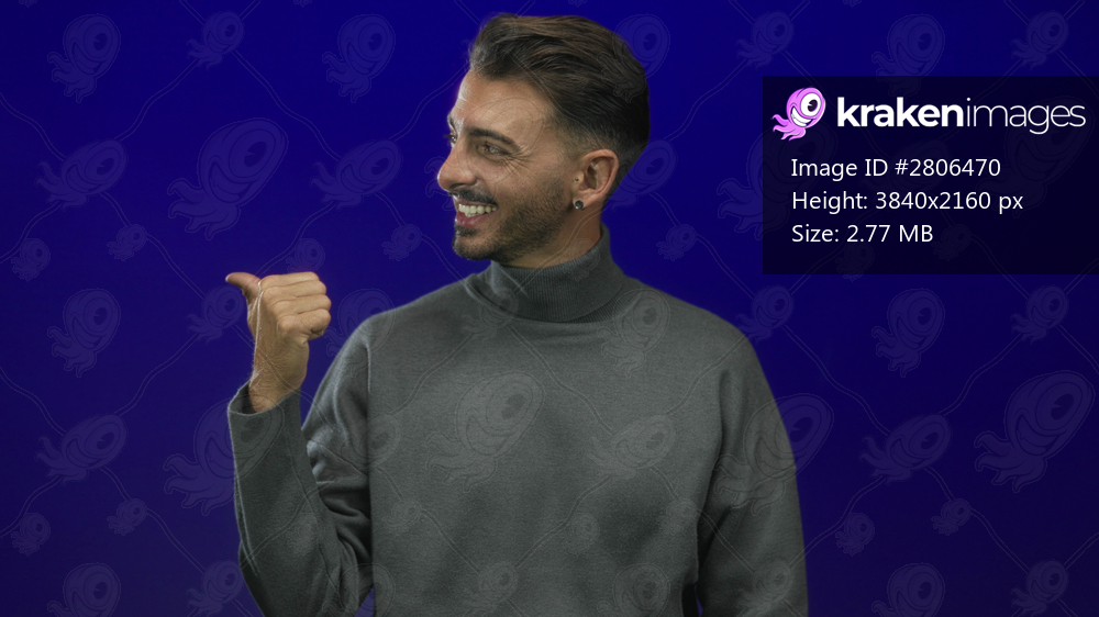 Man pointing thumb to side with a bright smile and relaxed posture against a vivid blue studio backdrop; confidence.