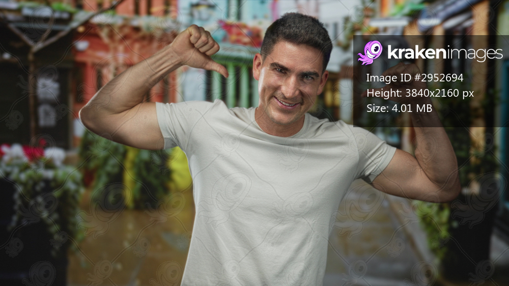 Man pointing thumbs at his chest on a narrow city street, smiling and flexing biceps in a white t shirt; confidence attitude.