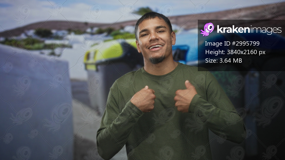 Man pointing thumbs to chest beside blue and yellow recycling bins on street with white buildings and palm tree; confident charm.