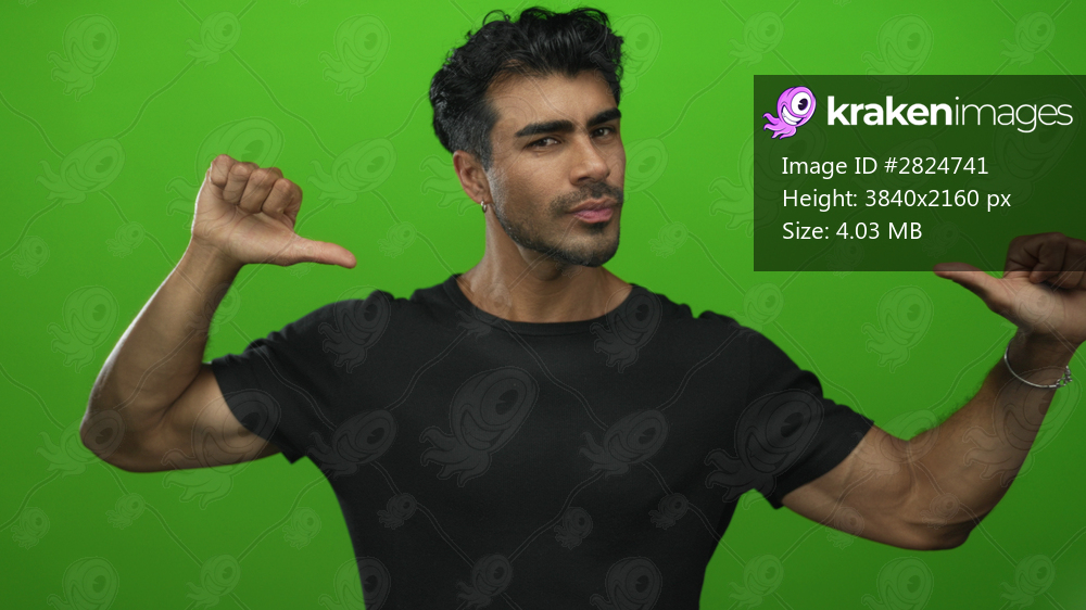 Man pointing thumbs to chest showing bare muscular arms and a confident expression in green studio; self pride.