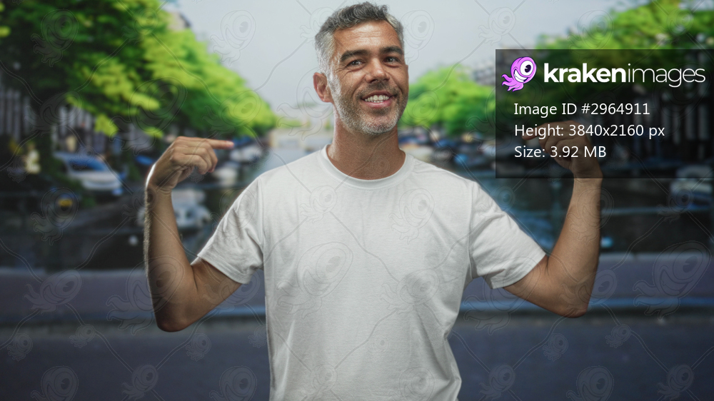 Man pointing thumbs to chest wearing white shirt and casual pose on street beside canal bridge with trees and cars visible; confidence.