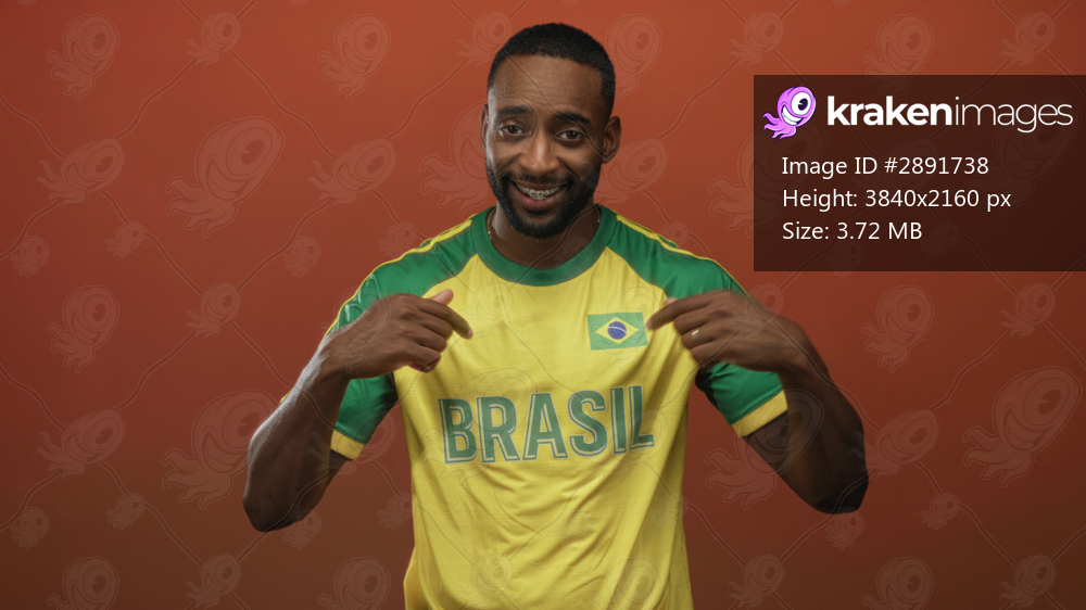 Man pointing to brasil jersey and flag patch, smiling and showing braces while wearing yellow and green shirt in orange studio; pride.