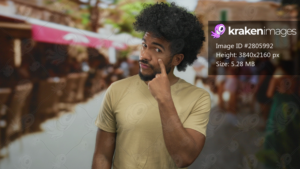 Man pointing to eye while standing in a bustling outdoor market street in a city, surrounded by blurred people, showcasing a lively and casual atmosphere. - Kraken Images