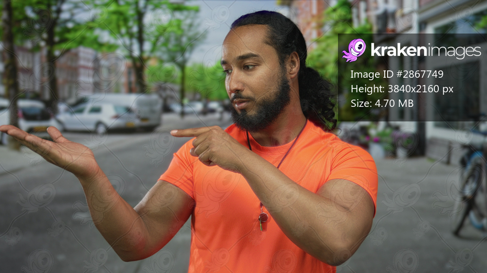 Man pointing to open palm on street wearing bright orange shirt and whistle necklace near parked cars and bicycle; thoughtful reflection.