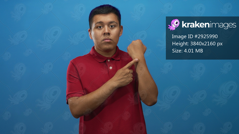 Man pointing to wrist and showing forearm skin in blue studio wearing red polo shirt with direct gaze; concern.