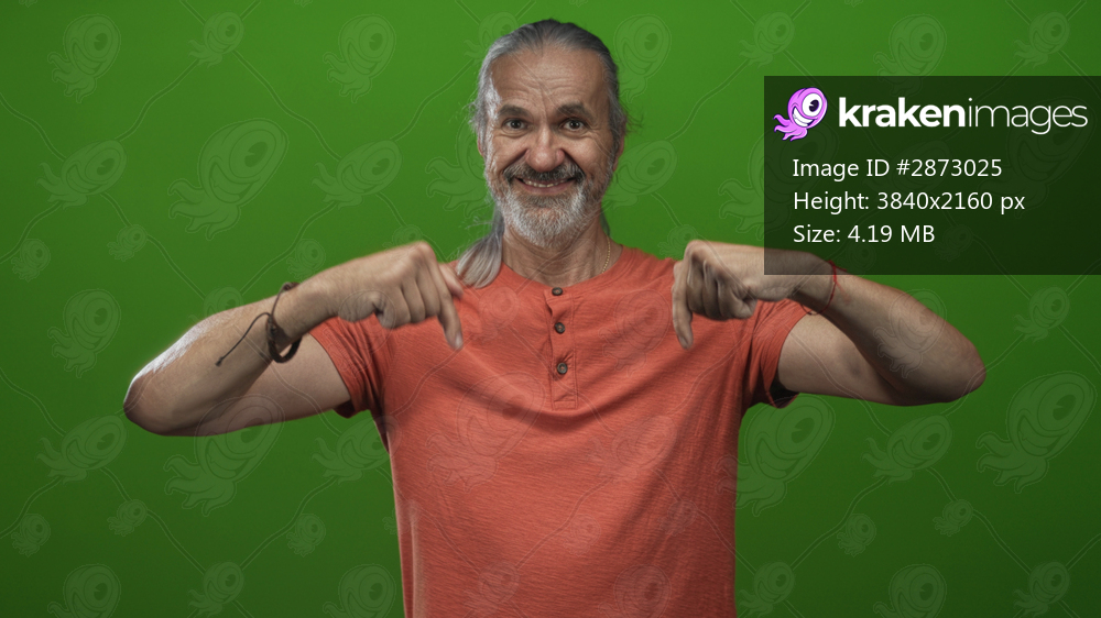 Man points both fingers down in a green studio, hoary long hair and beard, wearing orange shirt; self promotion playful.