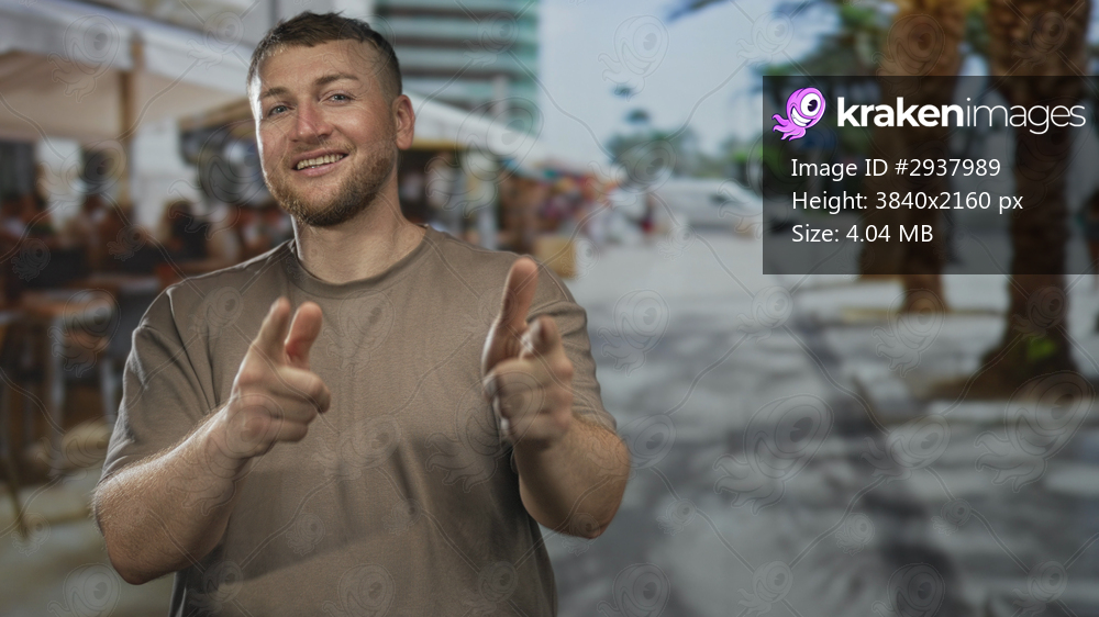 Man points both fingers toward viewer on a sunny street cafe lined with palm trees and outdoor tables; friendly confidence.