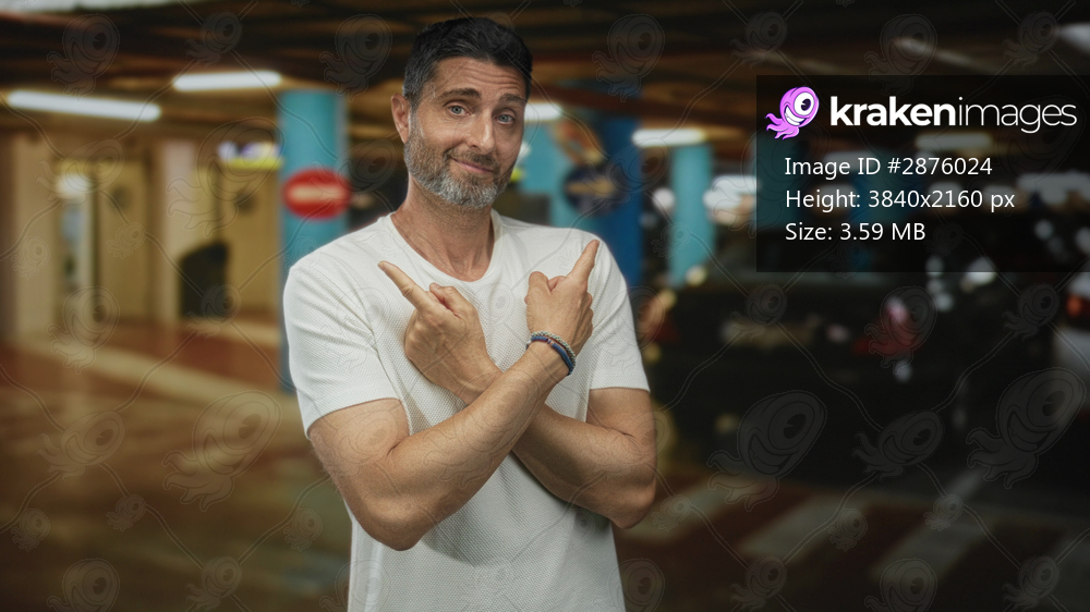 Man points both index fingers left and right in a parking garage wearing a white t shirt and watch; indecision choice dilemma.